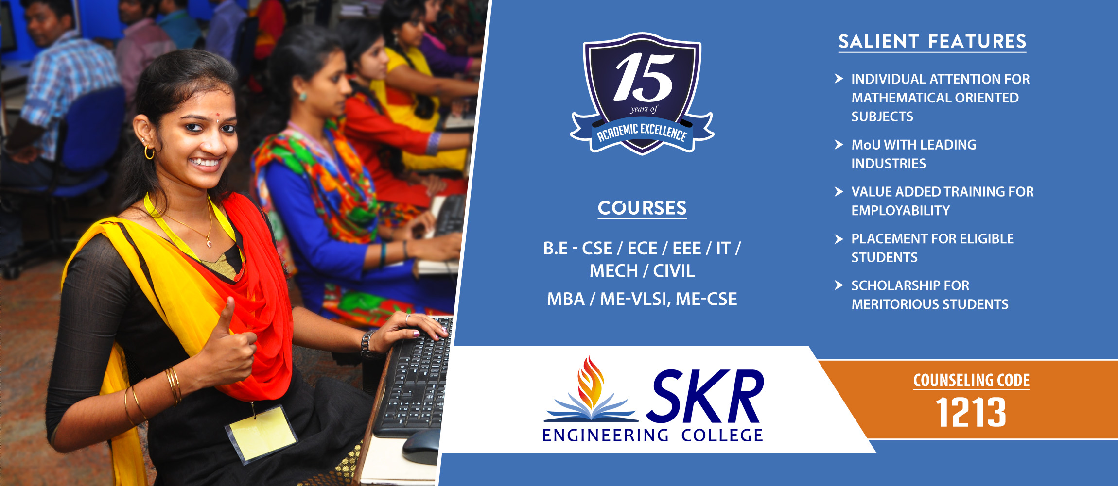 SKR Engineering College was established in 2001. The Institution is NBA Accredited, ISO 9001:2000 Certified, AICTE approved, and affiliated to Anna University, Chennai. The Institution envisages a Silent Knowledge Revolution in terms of engineering education. Read more